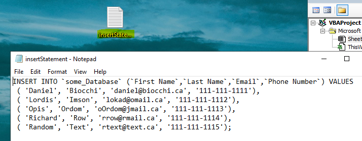 - Insert statement will be printed to a file on the desktop.